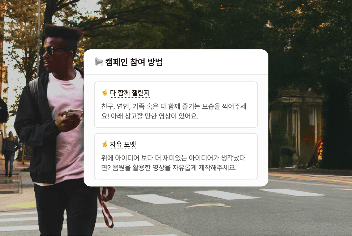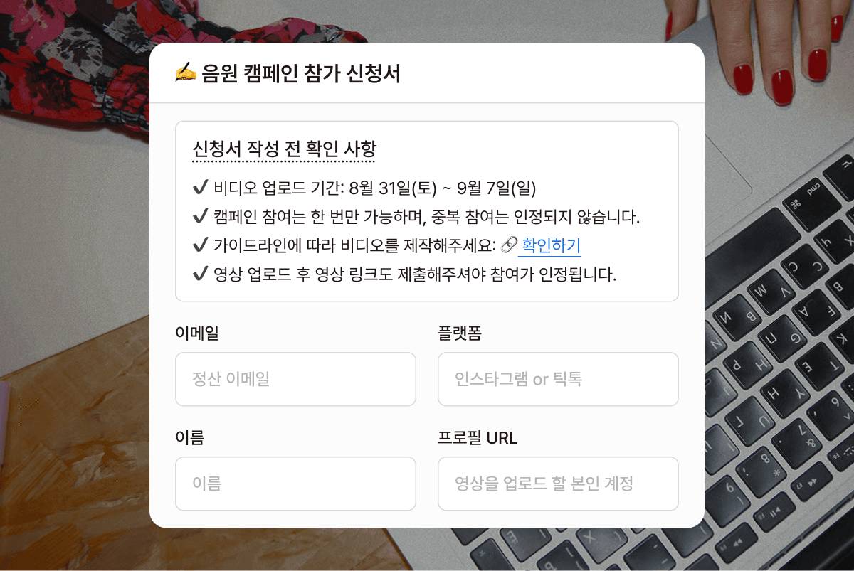 캠페인에 참여하고 싶다면 신청폼을 작성해 제출해주세요. 요청드리는 건 보통 20–30초 분량의 영상 한 편입니다. 제작 스타일, 기존 콘텐츠 분위기, 캠페인과의 적합성을 보고 선정하며, 팔로워 수 제한은 없습니다. 크리에이터라면 누구나 지원 가능해요.